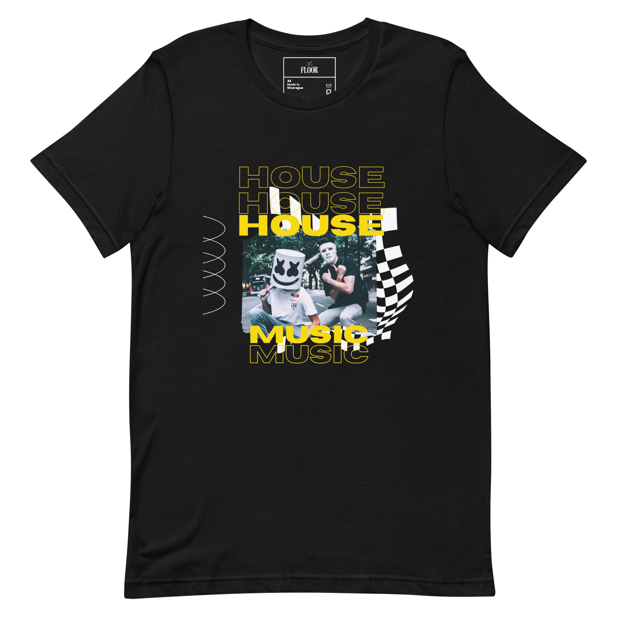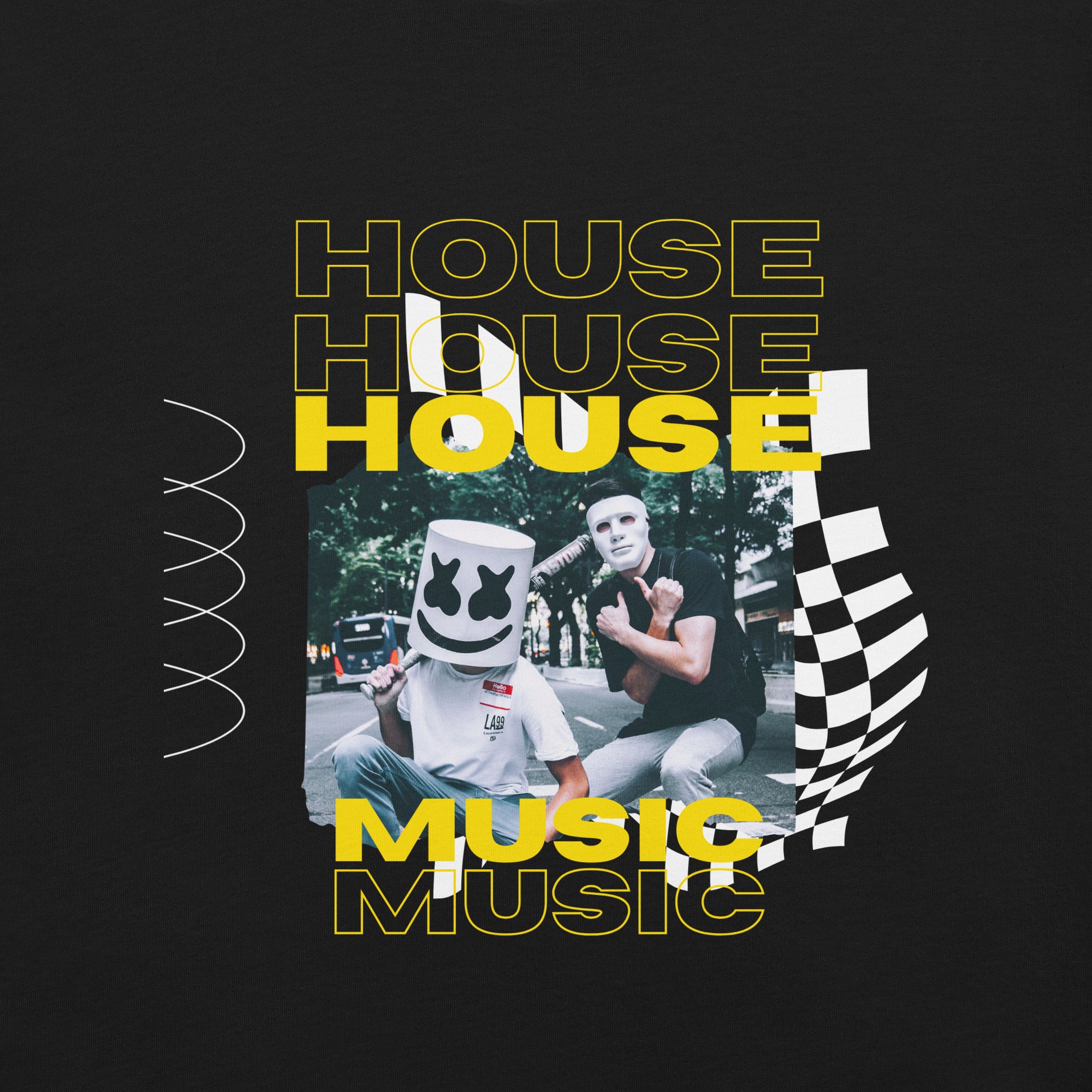 It’s a bootleg-style collage that mixes the polished world of EDM with the grit of underground streetwear. The electric yellow "HOUSE" typography stacks boldly against the black canvas, making this tee a loud statement for anyone who knows the drop is coming.
