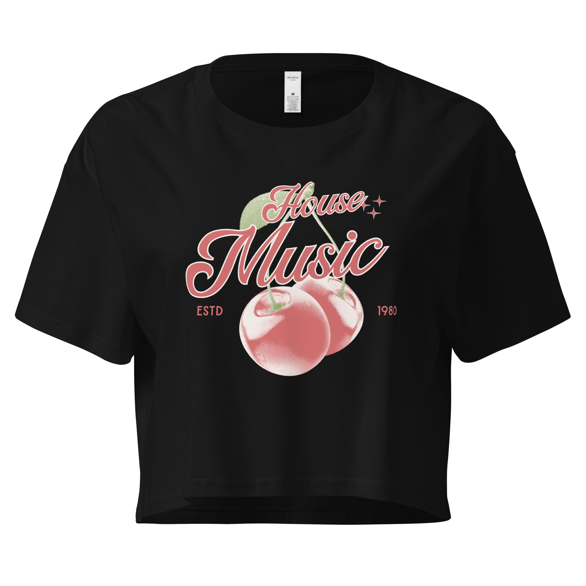 Funky house, dark dancefloors. We took our retro "House Music" cherry graphic and gave it a nighttime update on a premium black crop. The pink and red script pops against the dark canvas, capturing that sweet spot between disco nostalgia and modern rave style.