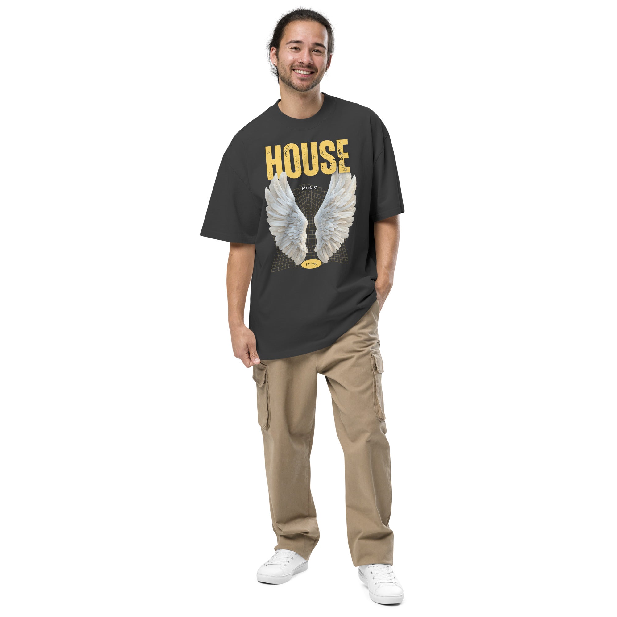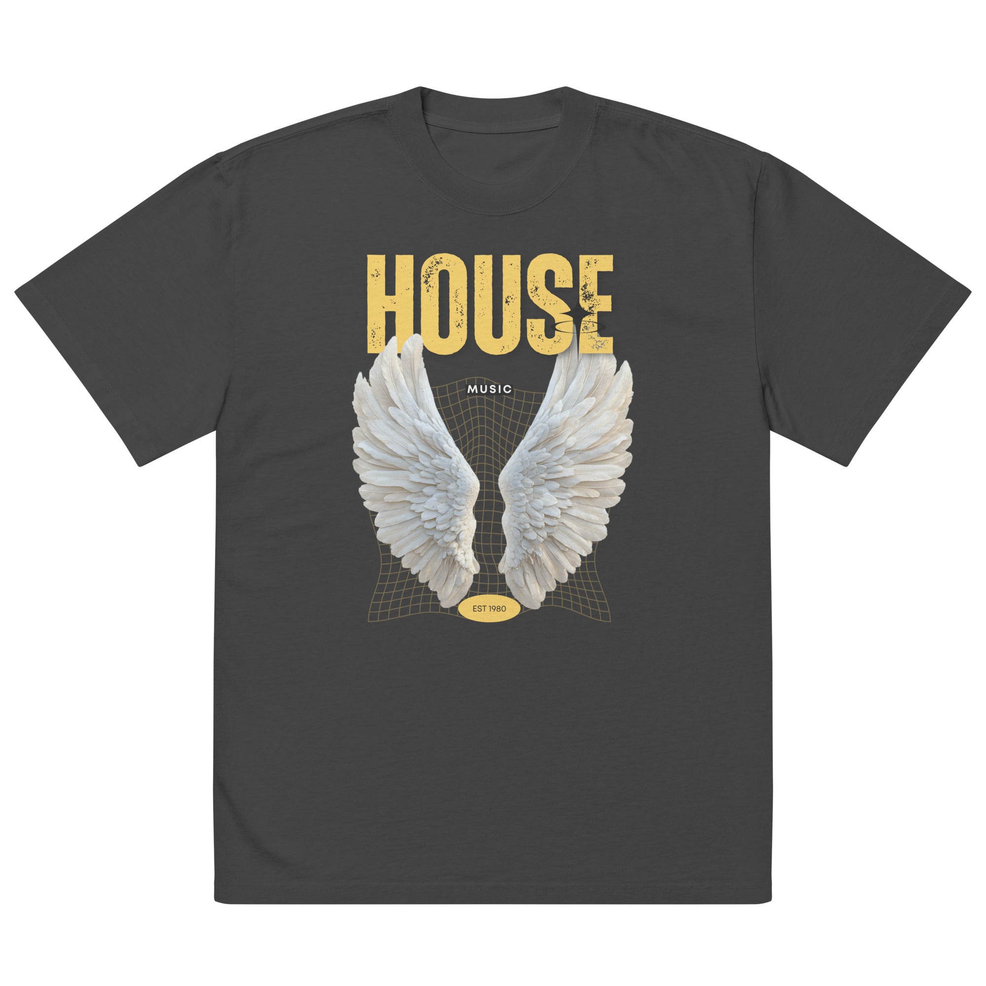 "House is a spiritual thing." We captured that feeling with this design, blending angelic wings with a retro-future wireframe grid. It features bold, distressed "HOUSE" typography in yellow, anchoring the design in the golden era with an "EST 1980" badge.